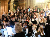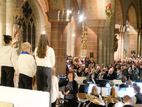 Anschließend sang der aus fast 50 Sängerinnen und Sängern bestehende große Schulchor unter der Leitung von Musiklehrerin Barbara Kupfer-Baumert den Kanon Ich will den Herrn loben von Georg Philipp Telemann. In dem darauffolgenden Stück Gloria in excelsis Deo, komponiert von Kirchenmusiker Carsten Klomp, entfaltete der Chor seine ganze Stimmgewalt und majestätisch erklangen im Fritzlarer Dom die Worte „Ehre sei Gott in der Höhe!“